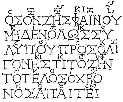 Pierwsze próby zapisu dźwięku dla instrumentów w starożytnej Grecji wykorzystywały pismo fenickie oraz nazwy strun kithary. Nieco później stworzono również zapis wokalny, wykorzystujący znaki alfabetu jońskiego. W taki sposób zapisana jest najstarsza zachowana pieśń, Epitafium Seikilosa.